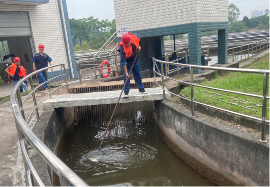 “值班員楊紅利報告,水廠源水明渠發現少量漂浮死魚,懷疑源水水質受到嚴重污染。”隨著應急值班警報的拉響,參演人員迅速在研城水廠調節池前緊急集結,應急處置領導小組隨即指揮水質檢測組、污水排放組、清理打撈組、巡渠觀察組等相繼奔赴指定區域,分頭展開應急處置相關工作。
