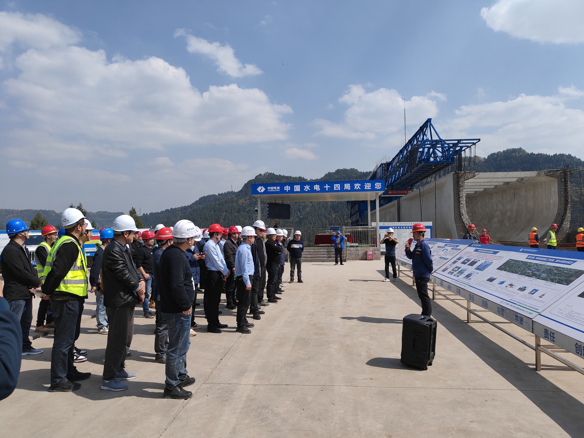 參會人員在唐家溝渡槽施工現場實地參觀學習,詳細聽取關于渡槽建設的介紹,深入了解了渡槽設計理念、施工難點、技術創新、遇到的實際問題及解決方案等內容。